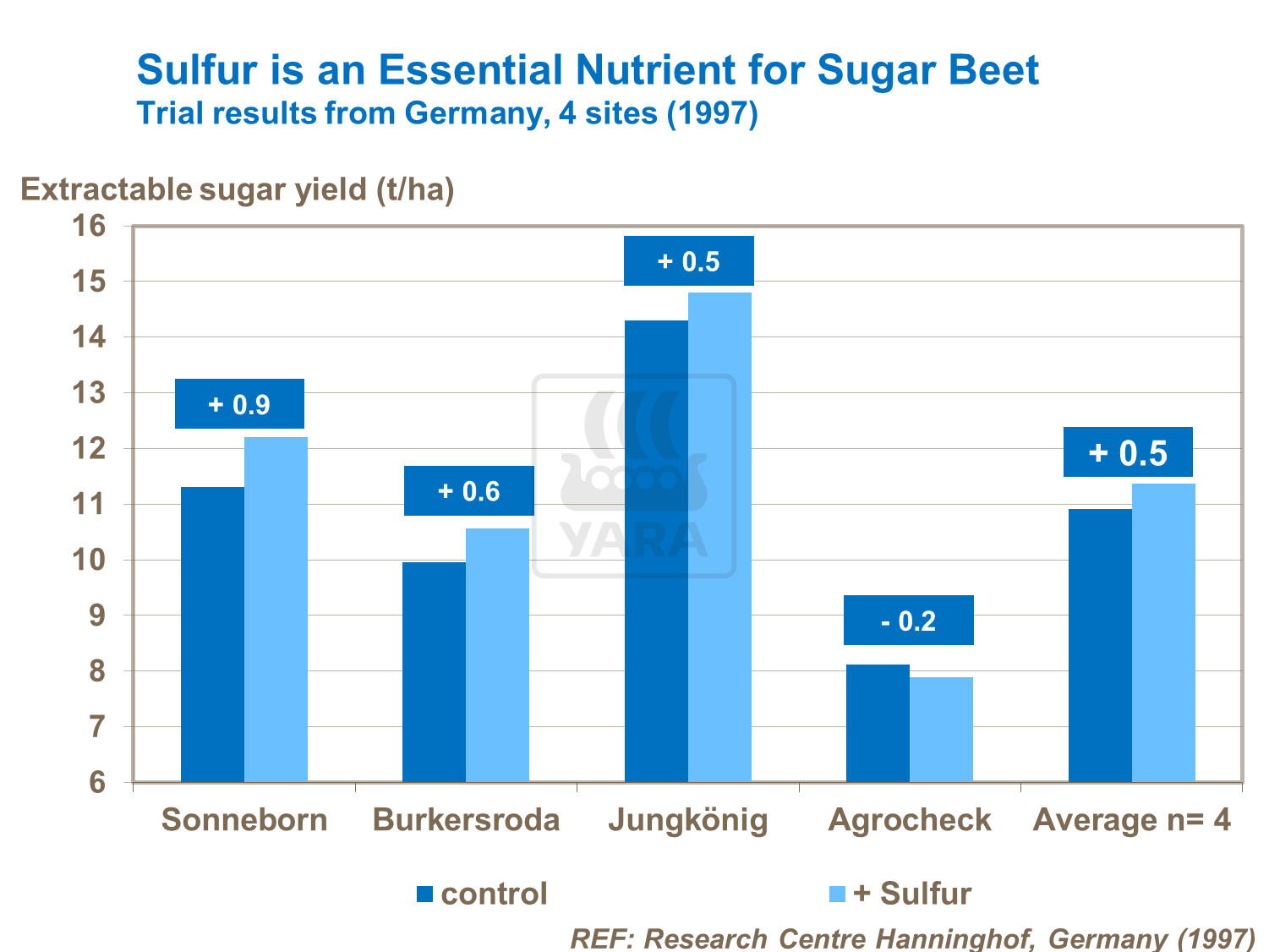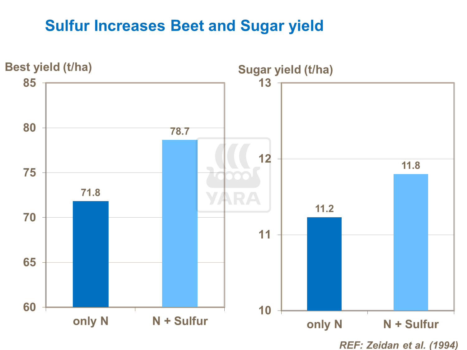 Siarka jest istotnym składnikiem wszystkich białek i enzymów, wśród białek największy wpływ ma na chlorofil – dlatego jej niedobór może znacznie zmniejszyć plon. Pobranie siarki przez buraki przy plonie 50t/ha wynosi około 32 kgS/ha, przy czym 14 kg pobierają liście natomiast 18kg/ha korzenie.