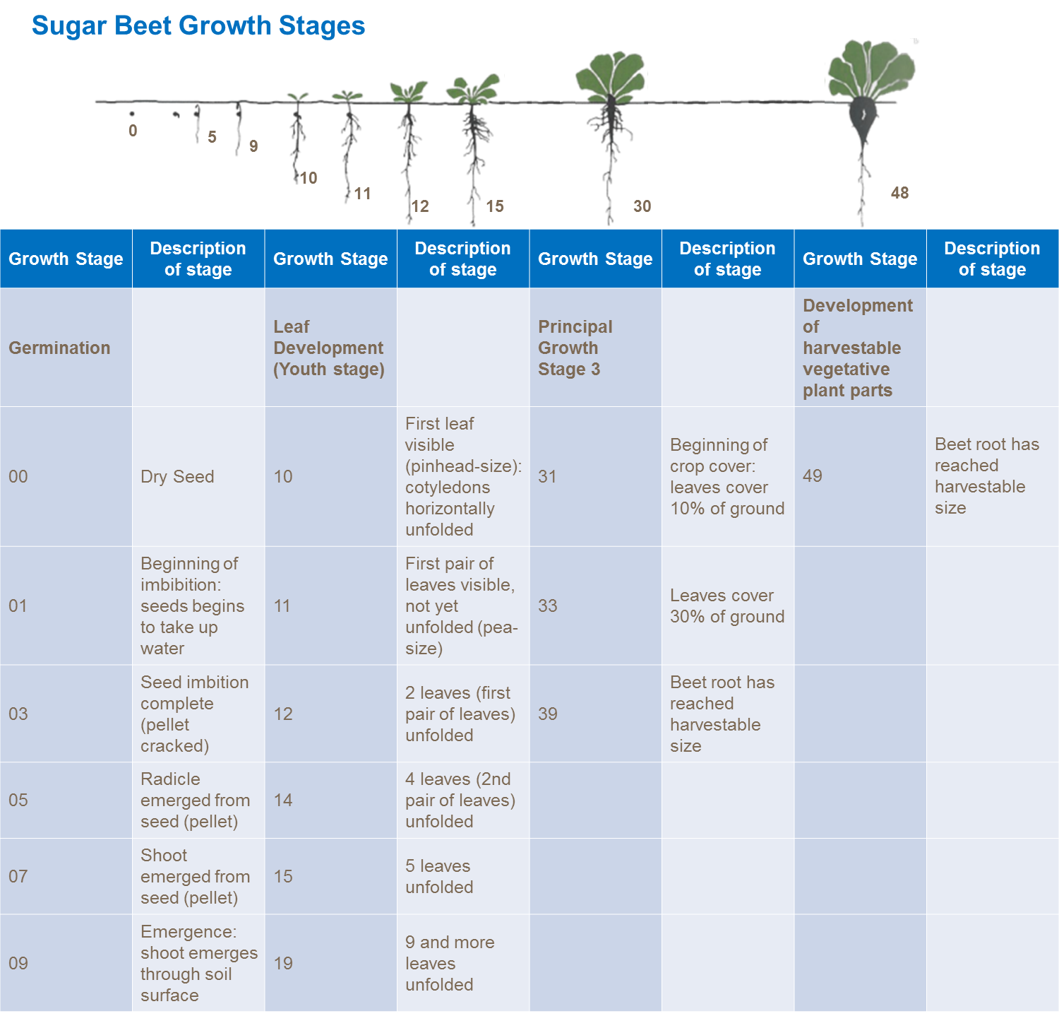 Wzrost roślin buraków cukrowych można opisać bardziej szczegółowo używając skali BBCH. Określa ona szczegółowo poszczególne etapy, fazy wzrostu buraków cukrowych.
