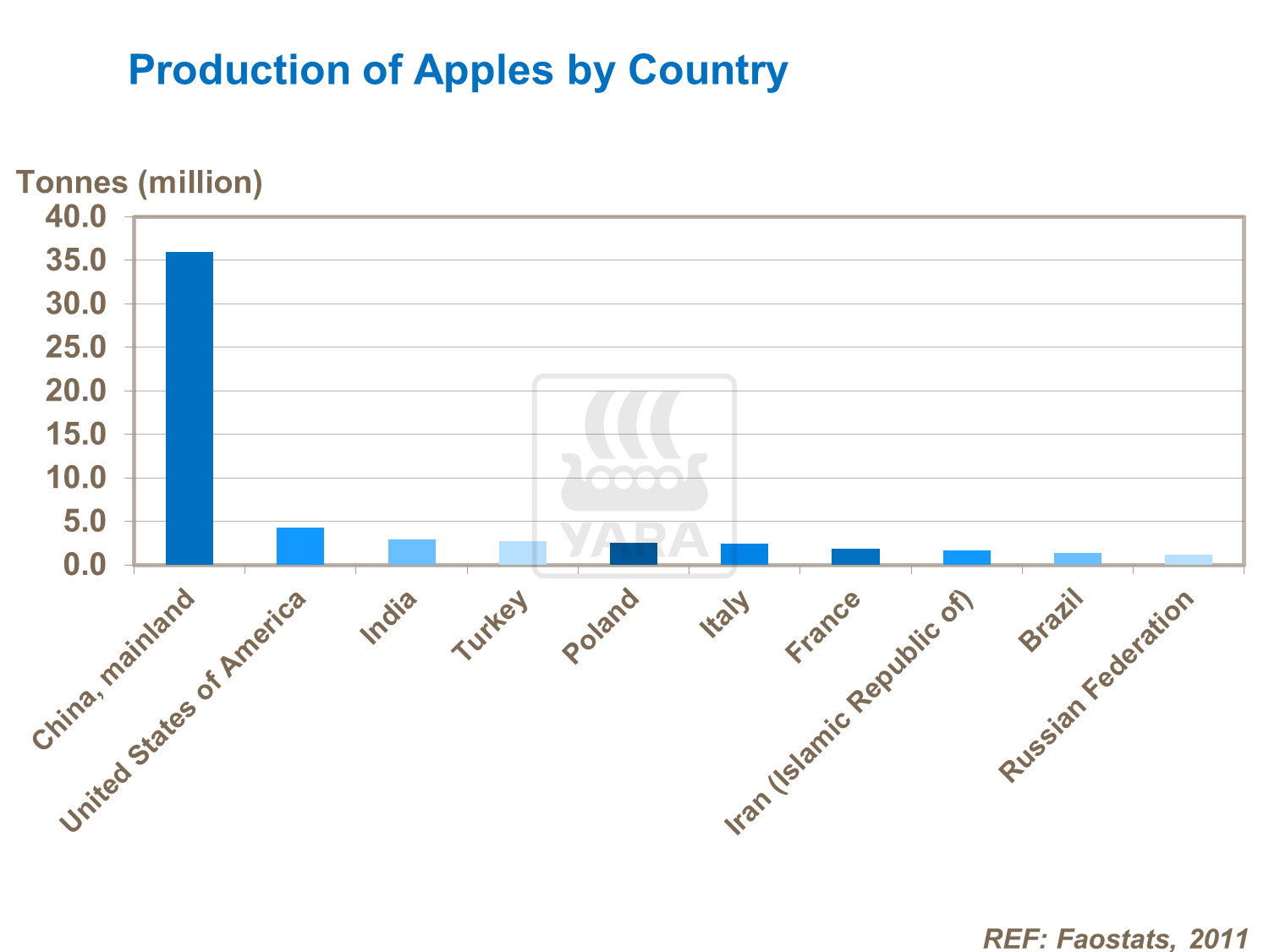 Światowy rynek jabłek, wielkość w tys. ton, sezon 2012/2013 (za www.fresh-market.pl): Świat: 67 852, Chiny: 38 000, USA: 4 200, Turcja: 2 900, Indie: 1 750, UE 27: 11 297.