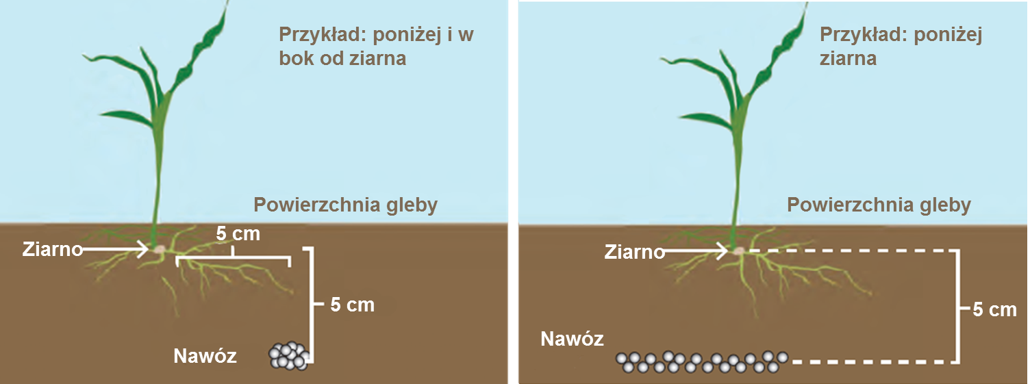 W produkcji kukurydzy często stosowane jest nawożenie składnikami pokarmowymi w pasach przypadających ok. 5cm od nasiona rośliny. Powoduje to lepsze pobranie składników pokarmowych w szczególności azotu, fosforu i cynku, ze szczególnym uwzględnieniem wczesnych faz, kiedy system korzeniowy nie działa jeszcze efektywnie.