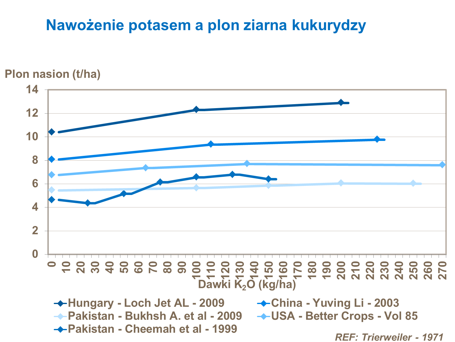 Krzywe zależności pomiędzy nawożeniem potasem a plonem kukurydzy wykazują jednoznacznie olbrzymi wpływ tego składnika na plon roślin. Najczęściej stosowana dawka tego składnika waha się w przedziale od 100-200kg K2O/ha. Kukurydza ma podobne zapotrzebowanie na potas jak na azot. Przy niskich dawkach azotu rośliny pobierają również mniej potasu, co powoduje spadek plonu. Niedobór potasu i fosforu może powodować zmniejszenie liczy ziaren na wierzchołku kolby.