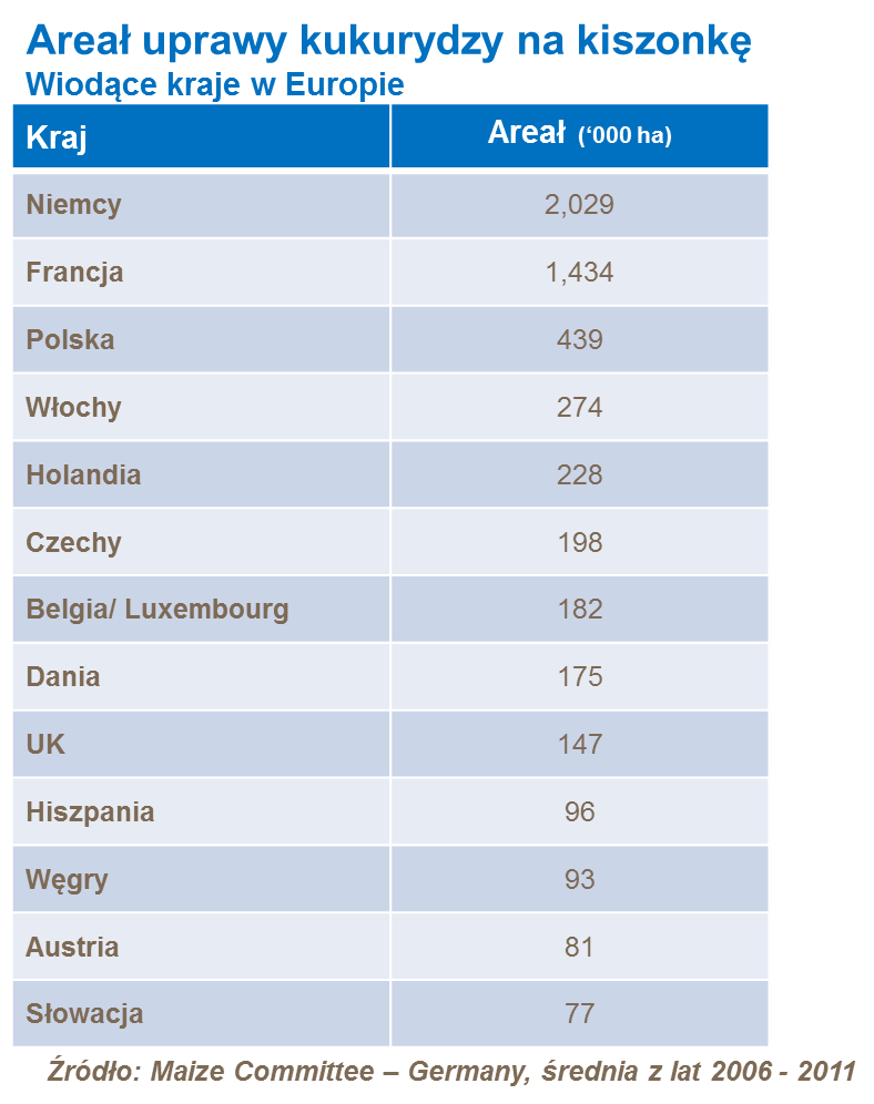 27 państw UE uprawia co roku około 5 mln ha kukurydzy na kiszonkę, podobny areał przypada na kukurydzę uprawianą na ziarno. Niemcy i Francja są wiodącymi krajami w uprawie kukurydzy na kiszonkę.
