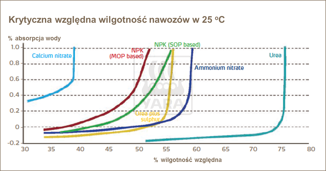 Wszystkie nawozy są mniej lub bardziej higroskopijne, co oznacza, że przy określonych warunkach, mogą wchłaniać wilgoć z powietrza. Niektóre nawozy są bardziej higroskopijne od innych i znacznie łatwiej, przy niższej wilgotności mogą wchłaniać wodę z powietrza.