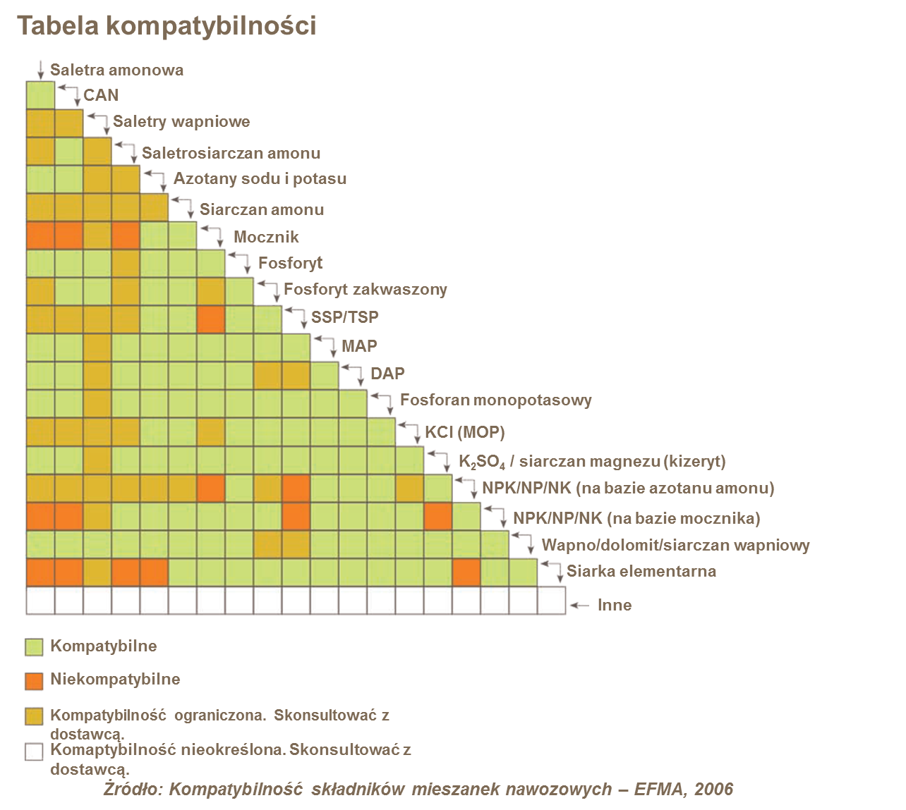Zgodność odnosi się przede wszystkim do możliwości mieszania różnych nawozów w zakresie bezpieczeństwa i zachowania jakości, np. zbrylania, powstawania pyłu, utraty wytrzymałości na cykle termiczne itd.