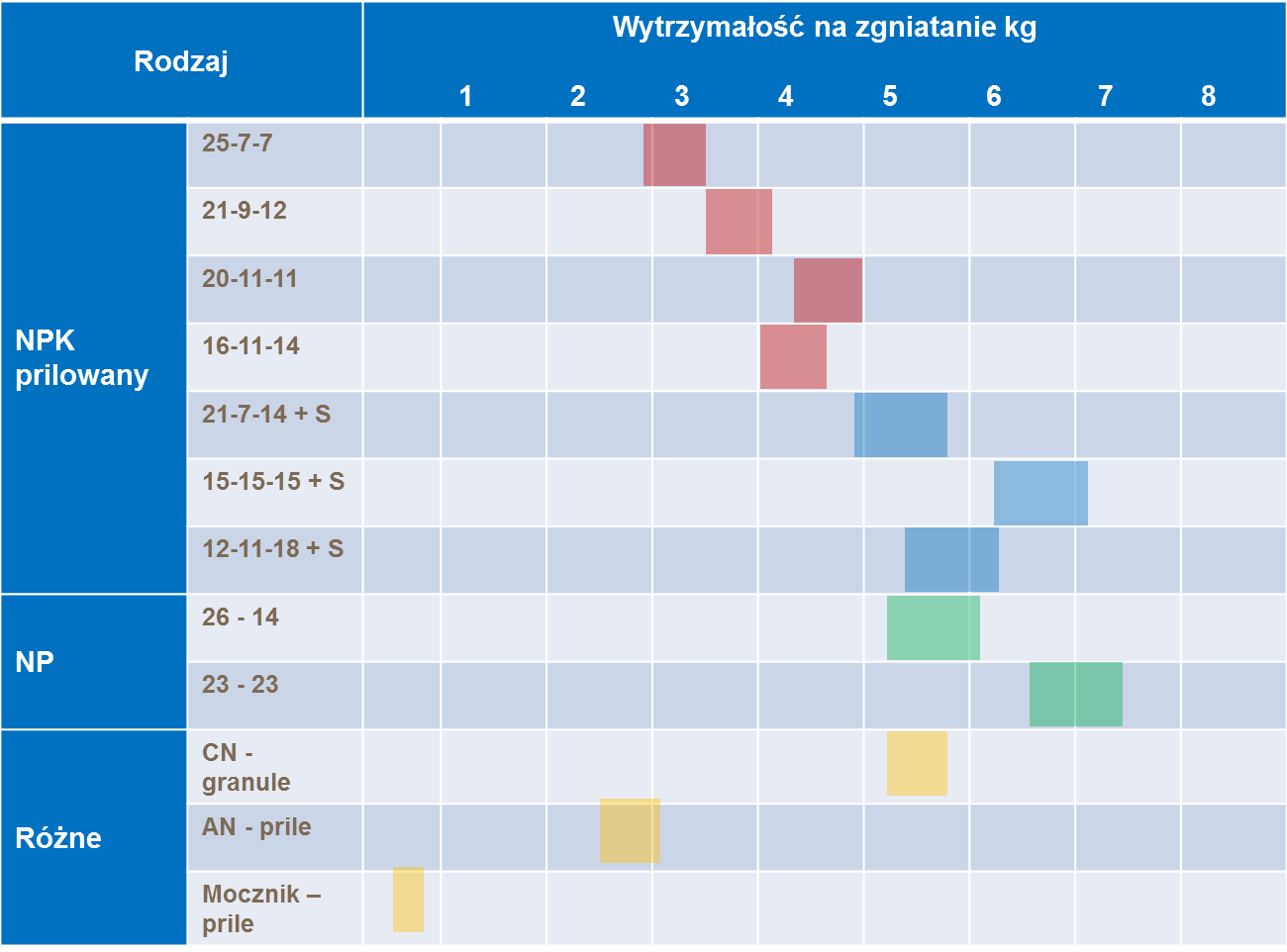 Wytrzymałość granul nawozu na zgniatanie różni się znacznie w zależności od ich składu chemicznego. Wytrzymałość na zgniatanie i kruszenie dla różnych rodzajów nawozów jest przedstawiona w tabeli.