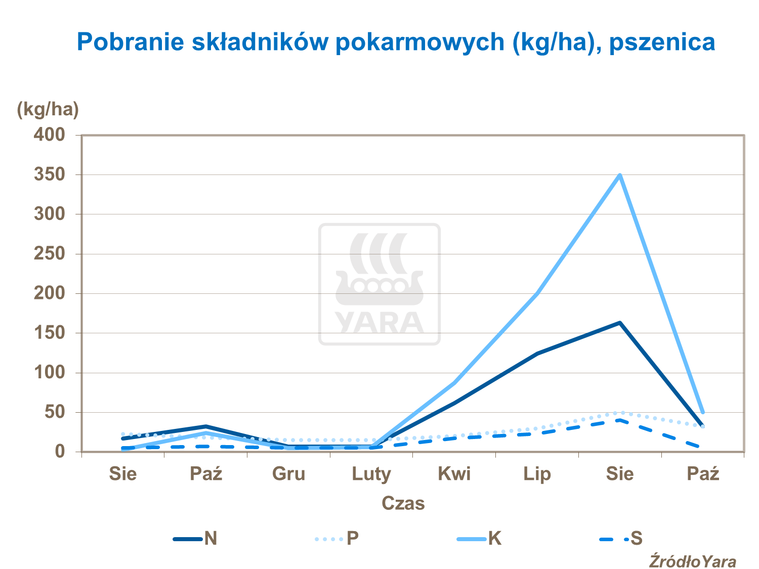 Azot i potas są składnikami wymaganymi w największej ilości w celu uzyskania wysokich plonów. Zapotrzebowanie na fosfor natomiast zbliżone jest do wymagań, co do siarki. Jak w przypadku innych makroelementów, największe zapotrzebowanie występuje wiosną.