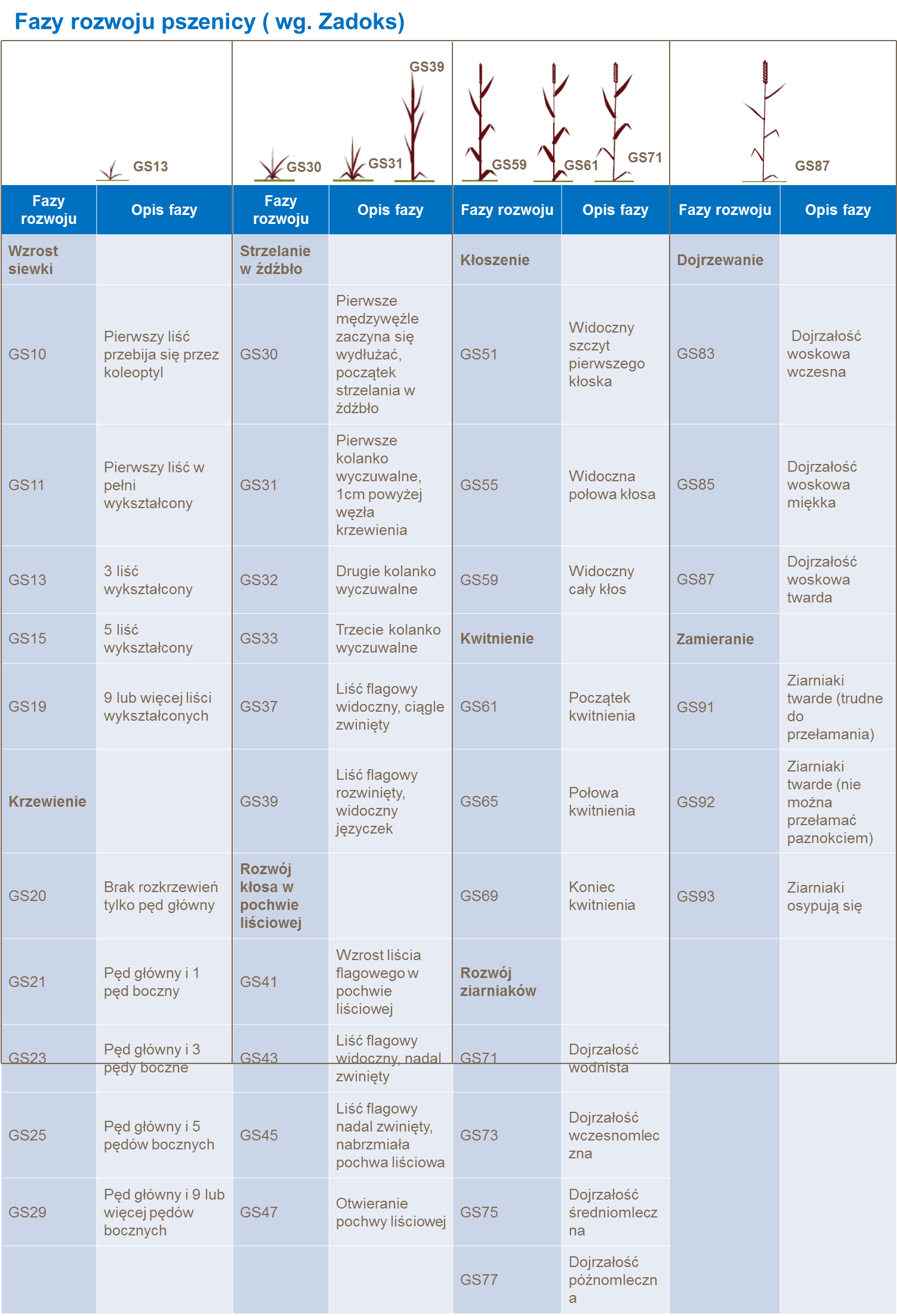 Rozwój pszenicy może zostać opisany za pomocą kilku różnych skal, które zostały opracowane na przestrzeni lat. Zazwyczja używane są: wg Zadoksa, Feekesa i Hauna, gdzie ta wg Zadoksa jest najczęściej używaną przy podejmowaniu decyzji agronomicznych. Poniżej przedstawiono szczegóły: