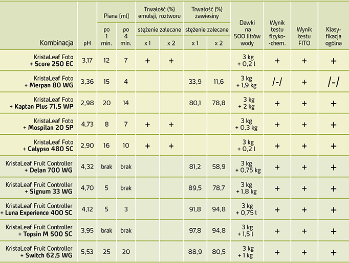Wynik / - / wskazujący na brak możliwości łącznego stosowania uzyskano dla 1 badanej mieszaniny - nawozu KristaLeaf Foto ze środkiem Merpan 80 WG. Przyczyną negatywnego wyniku jest stwierdzony brak fizykochemicznej zgodności przedmiotowej mieszaniny.