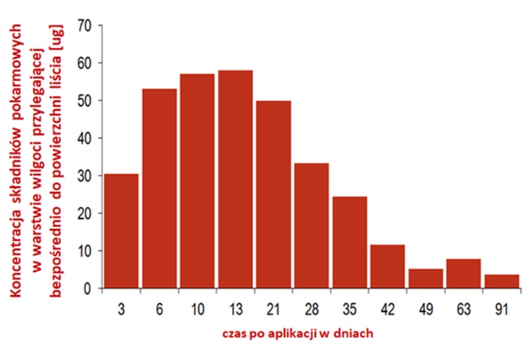 Termin zastosowania produktu rekomendowany jest w uprawie truskawek w postaci jednokrotnego oprysku przed kwitnieniem w dawce 3l/ha, ze względu na wolne i równomierne uwalnianie składników pokarmowych po naniesieniu na roślinę co przedstawiona na Wyk.1. Rośliny korzystają z zasobów do około 5 tygodni po oprysku co znosi konieczności wykonywania zabiegów dolistnych w czasie kwitnienia. Rozwiązanie jest to bezpieczne, ponieważ w czasie kwitnienia nie wykonujemy oprysków z uwagi na owady zapylające.