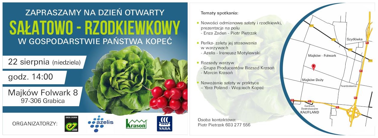 Serdecznie zapraszamy Państwa na dzień otwarty Sałatowo - Rzodkiewkowy, które odbędzie się w niedzielę, 22 sierpnia, o godzinie 14:00. Na swoich polach gościć nas będą Państwo Kopeć.