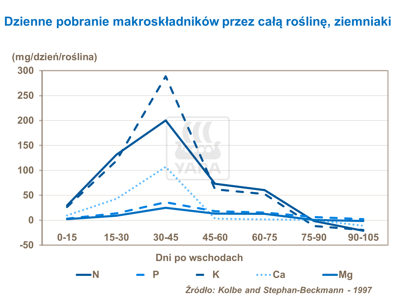 Ilość pobranych składników pokarmowych przez rośliny zależy od fazy wzrostu. Wysokie zapotrzebowanie na makroskładniki występuję podczas wczesnego wzrostu roślin, kiedy występuje intensywny przyrost biomasy. Dla zmniejszenia ryzyka utraty plonu bulw istotne jest dostarczenie składników pokarmowych w newralgicznych okresach, w których rośliny wykazują wysokie zapotrzebowanie na składniki. Potas i azot są pobierane i bardzo potrzebne roślinom podczas fazy wzrostu wegetacyjnego, tworzenia bulw i wzrostu bulw.